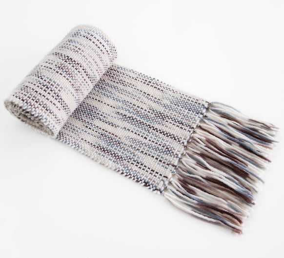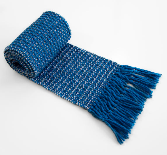 The pattern was designed to make the most of 5 skeins of yarn. Each Scarf requires about 250 yd of yarn (135 yd warp, 115 yd weft). Finished size about 6" by 60" with 5" fringe.