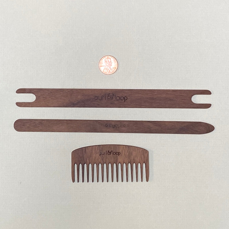 This adorably-sized comb will come in handy in all sorts of weaving situations. Wide combs produce straighter fell lines—the last placed pick—than narrow forks, they are easy to maneuver between picks if you need to make adjustment, and they provide a gentel tool for tidying fringe before finishing or trimming.