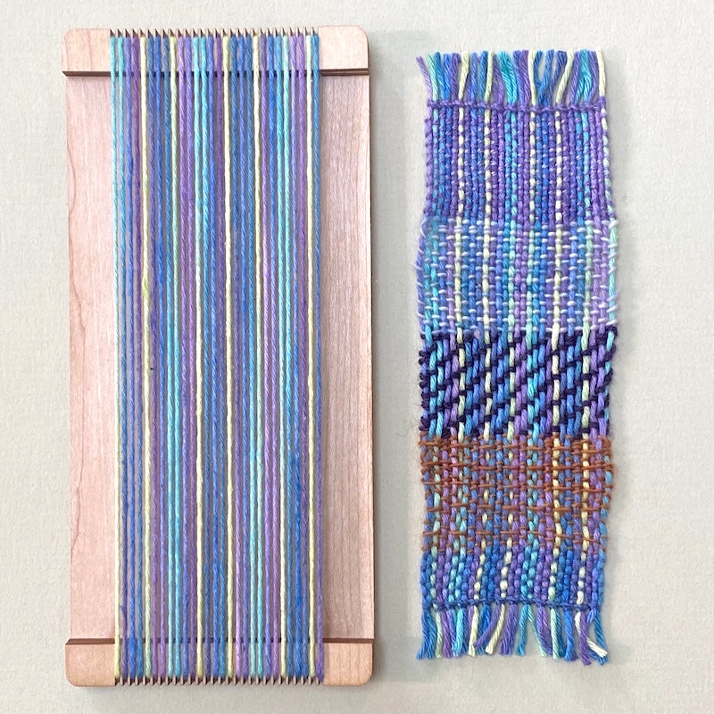 These little looms are handy for yarn substitutions, testing sett selection and structure combinations, and playing around with color. Even if you have just a tiny bit of yarn to spare, you can make an effective swatch to use before you dive into a larger project.